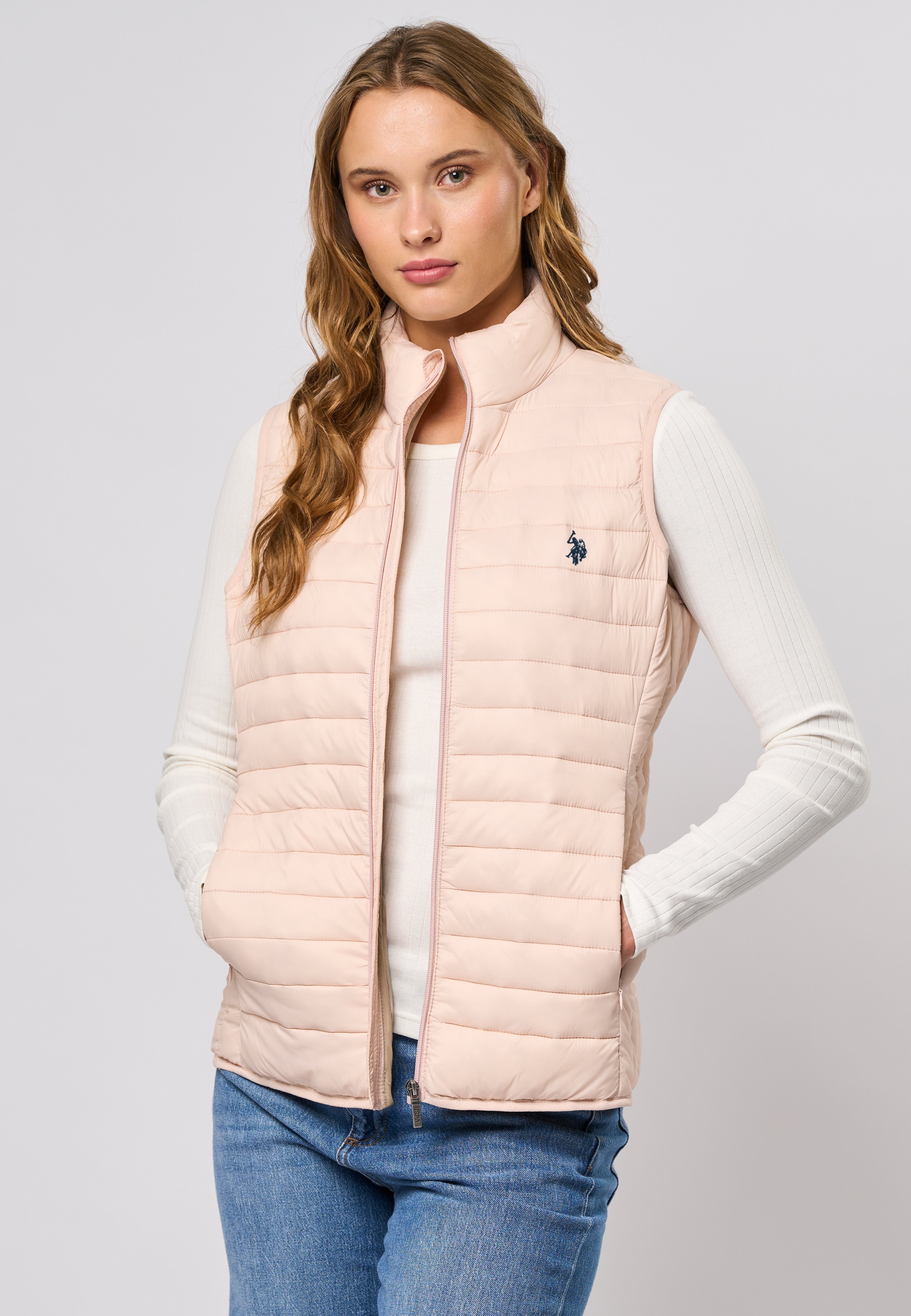 Jill er vår stilige og funksjonelle vest som kombinerer letthet og varme. Vesten er designet med høy krage, glidelåslukking og en lett vattert struktur som gir et moderne og sporty uttrykk. Den broderte logoen på brystet gir en elegant touch, mens det lette materialet gjør Jill til det perfekte lagvalget for de kjølige dagene.